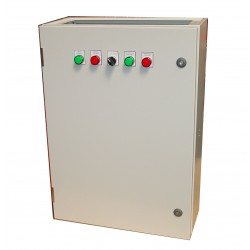 Housed in a robust mild steel enclosure rated to IP65. Supplied with loose gland plate, and door key. Enclosure specification to EN 62208, RAL7035, EN 60529, IK10, EN 61439-1-2. Cable entry as standard is arranged for bottom entry with a direct connection into the contactors. A 16A auxiliary output is provided for use with battery chargers, water jackets heater etc.
