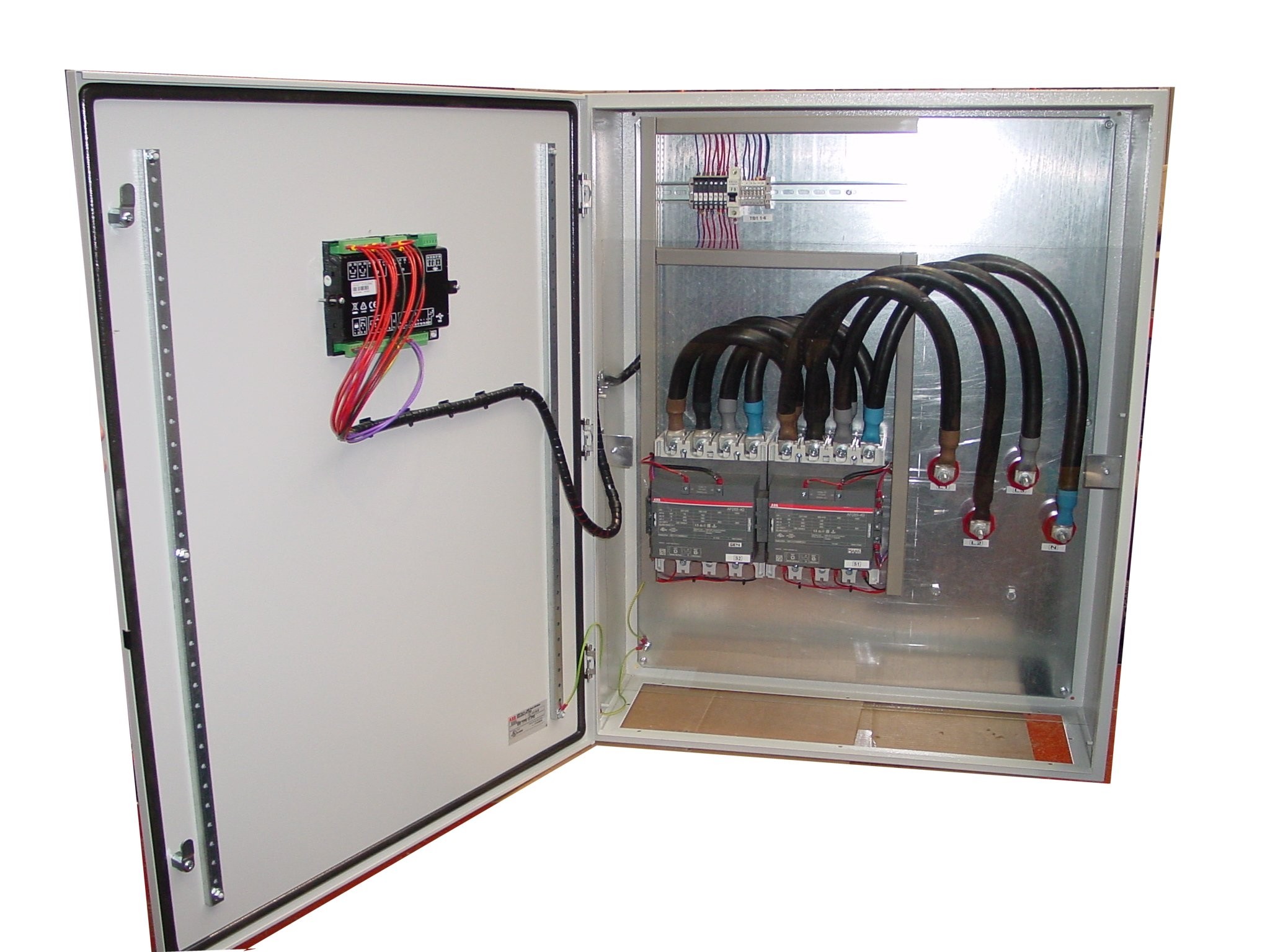Housed in a robust mild steel enclosure rated to IP65. Supplied with loose gland plate, and door key. Enclosure specification to EN 62208, RAL7035, EN 60529, IK10, EN 61439-1-2. Cable entry as standard is arranged for bottom entry with a direct connection into the contactors. A 16A auxiliary output is provided for use with battery chargers, water jackets heater etc.